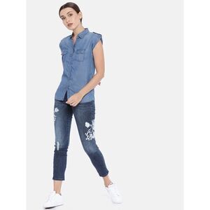 VERO MODA Blue Slim Fit Low-Rise Mildly Distressed Embroidered Cropped Jeans