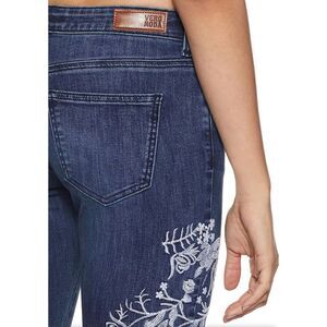 Blue medium wash 5-pocket low-rise embroidered jeans, mildly distressed with light fade and whiskering, has a button and zip closure, waistband with belt loops