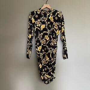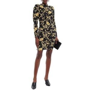 Veronica Beard Amile Ruched Silk Long-Sleeve Dress, VERONICA BEARD Amile Ruched Printed Stretch-silk Crepe De Chine Mini Dress, Size 2, Black with Gold Floral Barocco Print, Fitted, High Neck, Ruched Gathered Detail, Excellent Condition with No Flaws.
