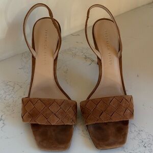 VERONICA BEARD Augustina Tan Braided Suede Slingback Heel Sandals In Pecan 9.5