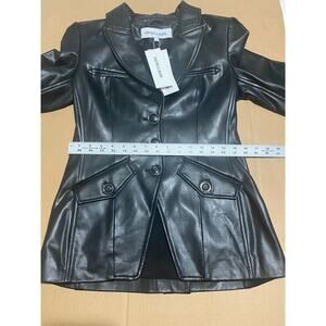 Details: Black vegan faux leather, tailored style with angular shoulders, nipped-in waist, elongated silhouette, single-breasted, novelty buttons, side flap pockets, classic notched collar, flattering shoulder pads, dickey-compatible, lined