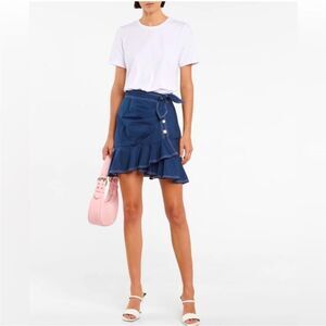 This mix media dress has a casual T-shirt bodice paired with a denim skirt, features a self-tie at the waist and ruffled hem.