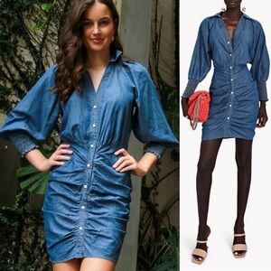 VERONICA BEARD Chambray Denim Ruched Puff Long Sleeve Smocked Cuff Shirt Dress 0