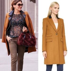 Elevate your outerwear collection with this timeless Veronica Beard longline coat in a rich camel hue. Featuring a sleek single-breasted silhouette, black contrast lapel, and structured tailoring, it effortlessly transitions from city chic to casual weekend outings. Perfect for layering over denim, dresses, or office-ready looks.