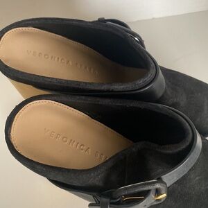 VERONICA BEARD "Dacey" Buckle Strap Black Suede Platform Clog with Goldtone Stud Trim