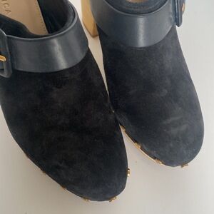 VERONICA BEARD Dacey Clogs Buckled Strap Studded Black Suede Wooden Heel Mule