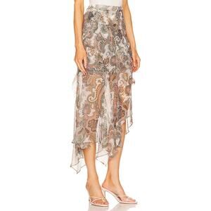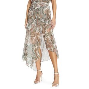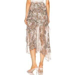 The Veronica Beard Eleonora Skirt blends elegance and ease with its asymmetric silhouette, paisley print, and ruffled trim. Crafted from 100% silk in a soft Barely Orchid Multi hue, this midi skirt features a concealed side zip and soft lining for comfort. Dress it up with heels or keep it casual with a tucked tee.