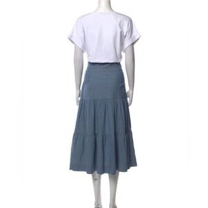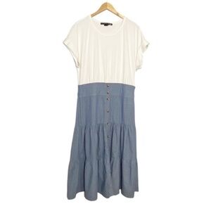 A classic T-shirt bodice is combined with a cool chambray skirt finished with a feminine flounce hem. Crewneck. Short sleeves. Invisible zip closure. Button placket at tiered skirt. Tie waist not included. Flounce hem. Cotton/spandex. Dry clean. Made in USA.