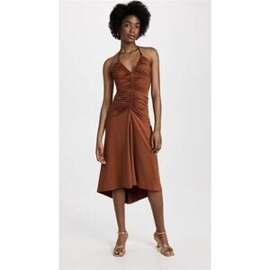 Veronica Beard Golden Brown Saskia Ruched Halter Midi V-Neck Dress
