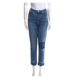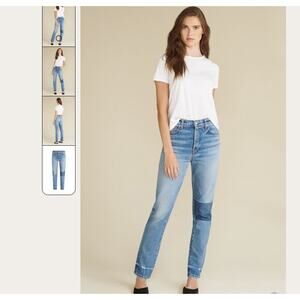 A patch detail and distressed hems update the high-rise Ryleigh jean. A classic straight leg silhouette finishes this classic-cool style. Wear with a sharply tailored jacket and stiletto booties for a polished look.