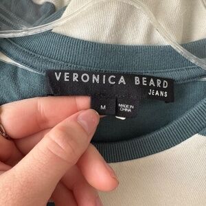 With bold stripes and a twist at the waist, this Veronica Beard Jean dress makes a classic, everyday-friendly T-Shirt dress feel a bit more special. Fabric: Mid-weight jersey. Stripe pattern. Crew neck and short sleeves. Covered elastic waist with twisted gather. Pullover design, no closure. Shell: 100% cotton. Color: Ecru/Teal. Unlined. Size medium. Great preloved condition