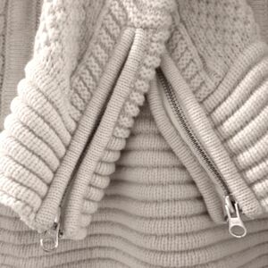 So much detailed went into this sweater. The waist, shoulders, and sleeves are knitted to emulate the ribbed padding found on biker jackets. They added a chuny front side zipper and zippered cuffs (YKK). The sleeves have a little extra lenth and the waist is slightly cropped for a modern touch.