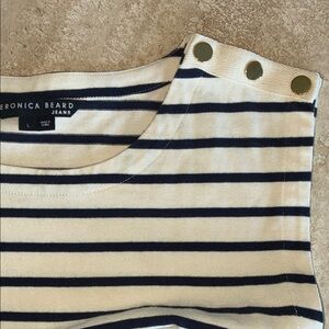 Chic VERONICA BEARD Nautical -themed Dress, Navy/Cream Striped Top, tiered Navy skirt. Short Sleeves, Elegant gold button accents on shoulder. Side waist zip. Fabric: 97% cotton, 3% spandex.