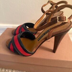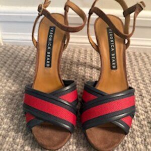 Chic and bold. The Olympia sandal pairs classic Veronica Beard style with a flattering silhouette that works from day to night. Designed with textured red and navy stripes, soft leather trim, and an adjustable ankle strap for a secure fit. 4 1/2" stacked heel adds just the right height. Perfect with jeans, dresses, or tailored looks.