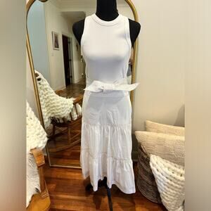 The Austyn is the newest addition to Veronica Beard's best-selling series of mixed-media garments. Pre-layered for maximum impact, and minimal effort, this dress combines a tiered, flounced midi skirt with a ribbed tank; a tie at the waist adds definition. Keep the look refined with strappy sandals.