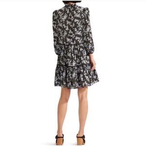 Easy-fitting, relaxed, romantic floral dress Black, light blue, and white floral printed fabric Satin piping highlights the tiers Bracelet length gathered blouson sleeves Split V-neck Pullover style Removable slip lining Drawstring neck ties