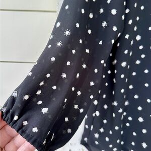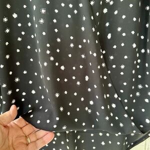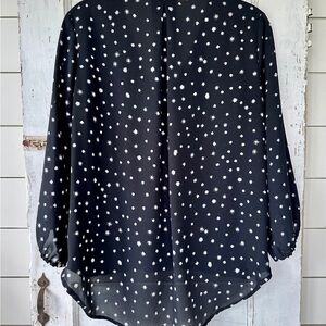 VERONICA M, NWOT, WOMENS, V-NECK TOP WITH FRONT CROSSOVER DESIGN. HI-LOW BLOUSY FRONT WITH INVERTED BACK PLEAT & SHIRTTAIL HEM. 3/4 SLEEVE WITH ELASTIC CUFFS. BLACK WITH WHITE PRINT. SIZE M