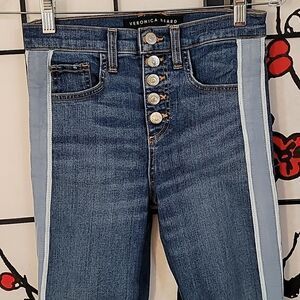 VERONICA BEARD Carolyn High Rise Baby Boot Jeans With Tux Side Stripe High-rise waist. Five-pocket style. Slim fit through thighs. Flared from knees. Released baby boot-cut hem. Cropped above ankles. Exposed-button fly; belt loops. Cotton/polyester/polyurethane.
