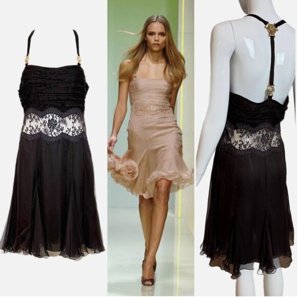 VERSACE 2005 Vintage Runway Espresso Brown Silk Dress Gold Medusa Lace