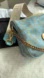 Stylish Versace crossbody with aqua design. Gold chain and logo detail. Perfect for any outfit.
