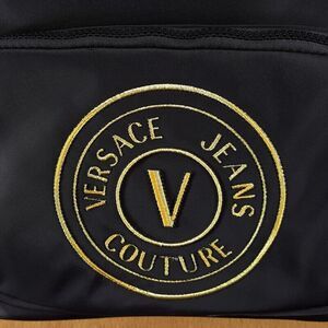 VERSACE Backpack Black Nylon V Emblem Gold Logo Unisex $325