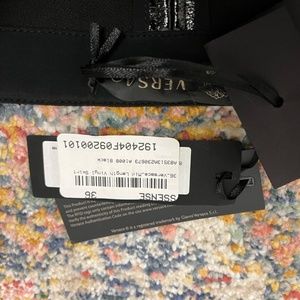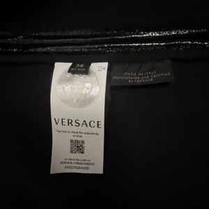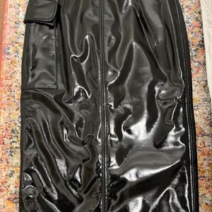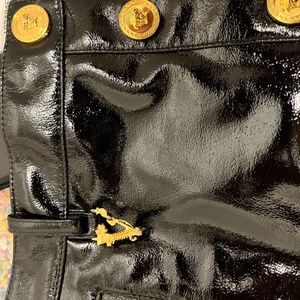 Mid rise black vinyl skirt. Pocket on hip. Belt looped waist. Carved logo hardware at front waistband. Snap front. New with tags. Authentication verified.