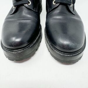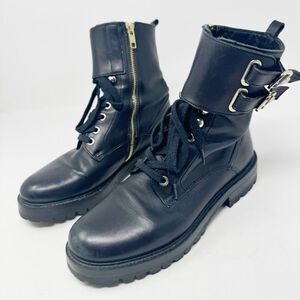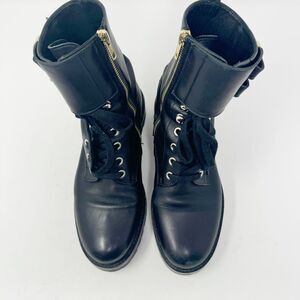 Really nice black leather combat style boots by Versace Collection. Lace up with gold zipper interior closure. Double gold buckle with Medusa head detail. Light scuffs mostly on toes and wrinkles at ankles from sitting stored. Hardly any wear!! Great preowned condition. Women’s size 37 (best fits a US 6.5-7).