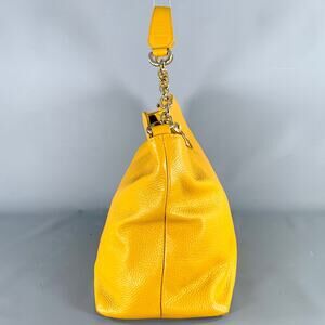 VERSACE COLLECTION handbag in a mustard yellow pebble grain leather featuring gold tone chain shoulder strap, spacious interior, and gold tone metal closure with Medusa head detail. Made in Italy.