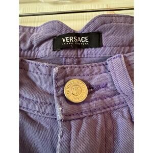 The product is a rare pair of Versace Collection Purple Stretch Jeans in size 25 with a regular fit. These slim-fit jeans feature a solid purple color, medium wash denim fabric, and a mid-rise waist. They have a zip and button closure, with subtle logo accents. The jeans also come with pockets and have a stretch feature for added comfort and flexibility. Ideal for women looking for a stylish and sophisticated denim option, these Versace jeans offer a unique and fashionable choice for everyday wear.