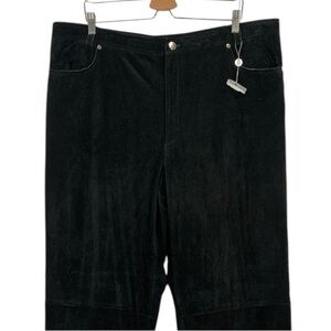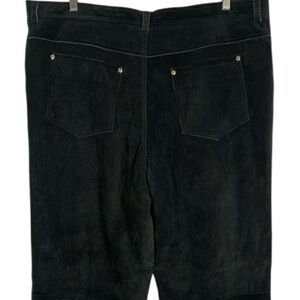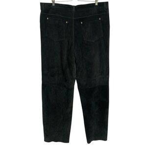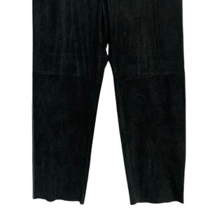 Features: 100% genuine suede leather fabric in black. Mid rise. Wide straight leg. Lined. Zip to button closure.