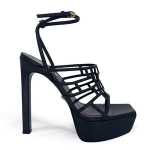 Set on high stiletto heels, these Greca Maze sandals from Versace are a must buy for every fashionista. Crafted using black leather they feature a cut-out Greca-motif pattern, a cage-effect ankle strap with buckle closure, stiletto heel atop a platform and an open toe silhouette. A distinctive design for a unique style.