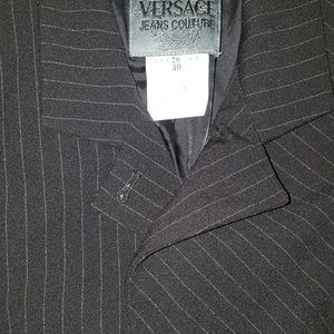 Excellent condition authentic Versace Jeans Couture slim-fit pantsuit fully lined, made in Italy. Unique differing-direction pinstrips on blazer (see photo w.button close up). Unstretched: pant waist 25", inseam 31.5", rise 9.5", hips 33", size label 24/38. Blazer shoulder to shoulder seam 15", bust 33", waist 30", size label 26/40, 2 back vents, 2 front pockets, 3 button close+smaller button close at collar for another look. Charcoal color w.light grey pinstripes.