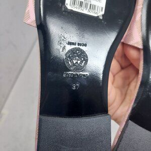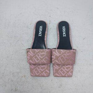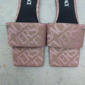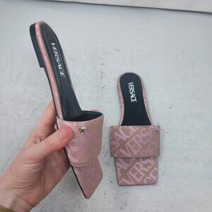 A classic slide sandal gets a sophisticated upgrade in a square-toe silhouette with logo-jacquard fabric detailed with a gleaming Medusa charm.