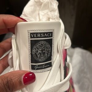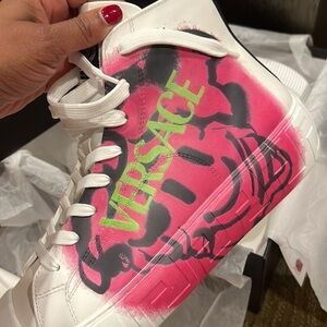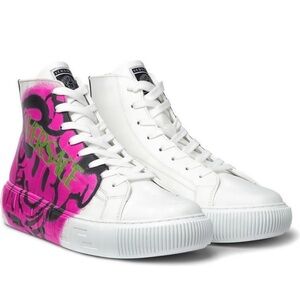 Graffitied at the sidewall of this leather high-top sneaker is a Medusa smiley, a symbol of celebration, freedom and dance-floor communities. Sold out everywhere. NWT. Comes with box.