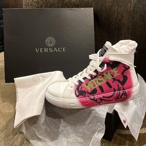 Graffitied at the sidewall of this leather high-top sneaker is a Medusa smiley, a symbol of celebration, freedom and dance-floor communities. Sold out everywhere. NWT. Comes with box.