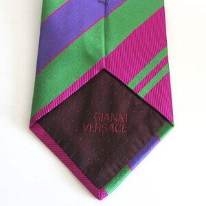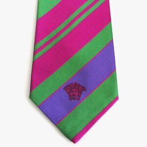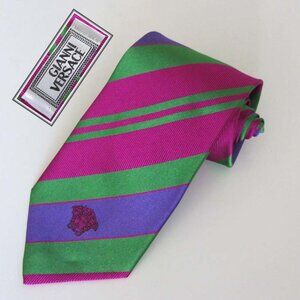 Men's Rare GIANNI VERSACE classic neck tie featuring a pointed tip, an adjustable fit, striped pattern throughout and large Medusa logo in front. The tie is lined with Gianni Versace signature silk lining and has Gianni Versace fabric tag attached on the back. Fabric: 100% Silk. Color: green, violet, pink-red. Made In Italy. Excellent condition ( see photos ).