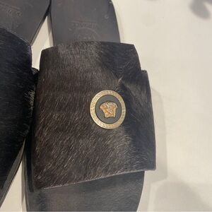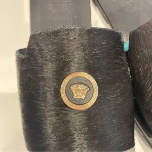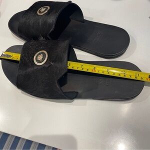 VERSACE Men’s Calfskin Leather Black Logo Slide Sandals —GREAT!! Could not locate size. Upper calf skin leather is in excellent condition. Soles are a little bit worn but still in good condition. See measurements for sizing. Approximately 10–10.5
