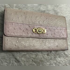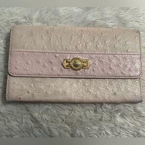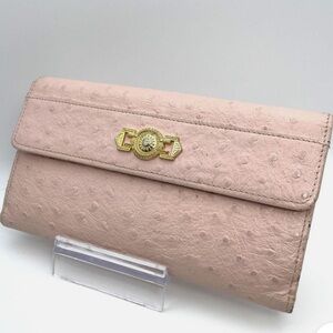This Versace ostrich leather long wallet showcases a luxurious pink design, accentuated by a distinctive sunburst gold-tone logo on the front. Its elegant bifold style and textured finish make it a sophisticated accessory for any occasion.