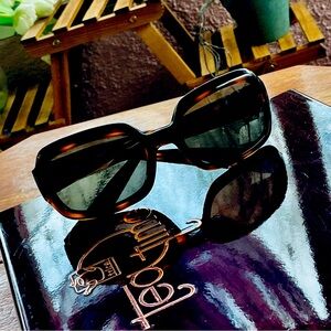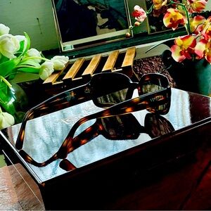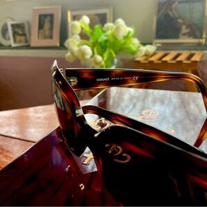 THE VERSACE NAME ON EACH ARM TOP SITTING ON A COPPERY RICH BACKGROUND STANDS OUT WITH VERSACE STYLE.
