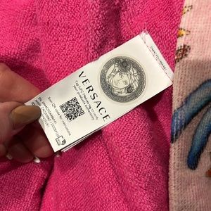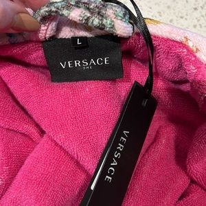 Unisex Versace terrycloth robe. Lounge around the house in comfortand style or wear it as a cover-up at the pool, beach or resort.