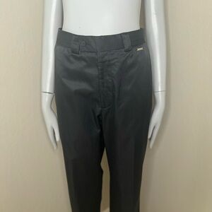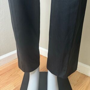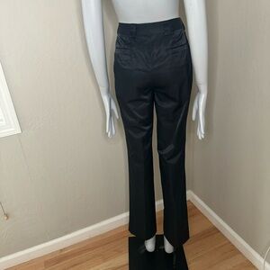 Made in Italy. IT 48 = usually US 12 - but they run small (as they are vintage + Italian designer, which run small in the waist for a size 12) See measurements below. Excellent condition. No signs of wear. Pockets on back are still stitched closed as new! They are clean, and pressed & all ready to wear. Shiny, smooth satin fabric. Black. 50% Cotton, 50% Polyester. Flat front. Wider Leg. Zip front. 2 slanted hip pockets. 1 small waistband pocket. Belt loops. Shown modeled on a size 0 mannequin with extra fabric cinched in back - fit may differ. Approximate measurements (taken when laying flat):