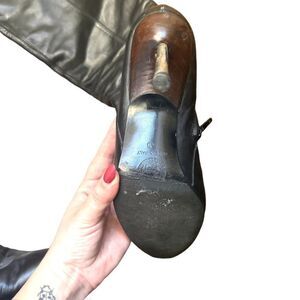 Black leather vintage boots. Full zip on interior side. Metal stiletto heel - slightly tarnished/scratched. Very light scratching/scuffing on leather, only one significant scratch (shown in last photo). Have been partially re-soled, Versace logo still visible! Great preloved vintage condition! Size US 10