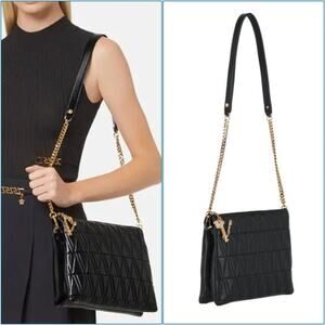 VERSACE Virtus V Bag Black Shoulder Crossbody Clutch Quilted Strap Authentic NEW