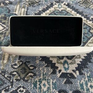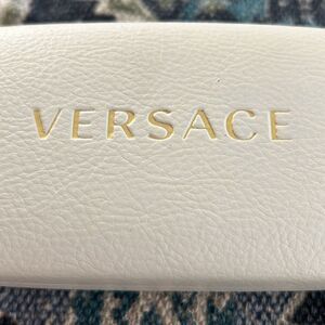 Versace cream colored eyeglass case. Gold riding on front, lined in black suede like material. In excellent condition.