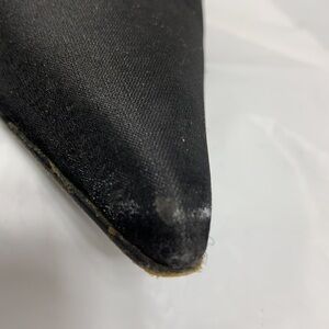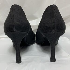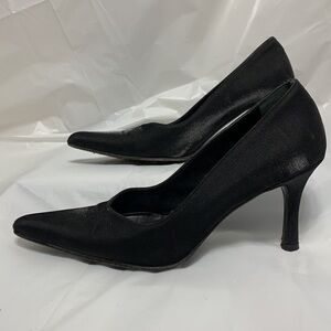 Versani Black Italian Made Fabric Heels with Leather Sole Size 7B. Some marks on back of one heel. One toe has a scuff area. See photos.