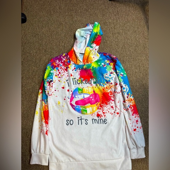 Vibrant hoodie with a playful graphic design. Features a splash of colors including red, blue, yellow, and pink.