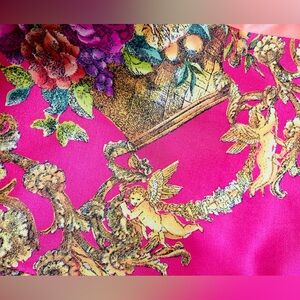 Gorgeous VERTIGO made in France. vibrant colors of Coral and Pink French Sateen Fabric ( 54% Cotton and 46” Poly) Ornate Romantic French inspired Scenes w/ lovely woman/ cherubs and beautiful Roses/flowers. double Breasted semi-fitted lined Jacket with shoulderpads, flap pockets and goldtone Buttons. Size Large. Measurements: shoulder 17” Underarm 38”, Waist 33”, Sleeves 23” Length. Wonderful Vintage New /pristine Never Worn Condition.( from a private Collection) Exquisite🌸