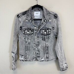 Non stretch denim, distressed detail, acid washed, deconstructed with raw hem, authentic rigid texture, single button at cuff, cropped length, denim jacket
