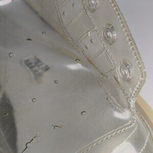 New with tags and box. NOTE: Plastic upper side panels, tongue, and wings have a milky discoloration due to the age of the plastic. Sole color is yellowish due to age. Due to old age, the plastic upper has cracking damage where the toe cap meets the tongue. The tongue, near the toe cap has minor cracking. The size label on one shoe is slightly shriveled due to old age.