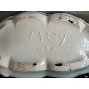 VERY RARE McCoy Pottery Hummingbird Double Cache Planter . This planter is one of McCoy’s rarest. The unusual hummingbird design makes it unique. Fewer of these planters were produced compared to simpler designs without the bird. Notably, it has one small break, which also created a crack on the underside- it is on the front right-hand side but looks a bit like the sweep of the base leaves, so not so noticeable. It has some glazing crazing, but overall in very good condition.Feel free to email me with any questions.